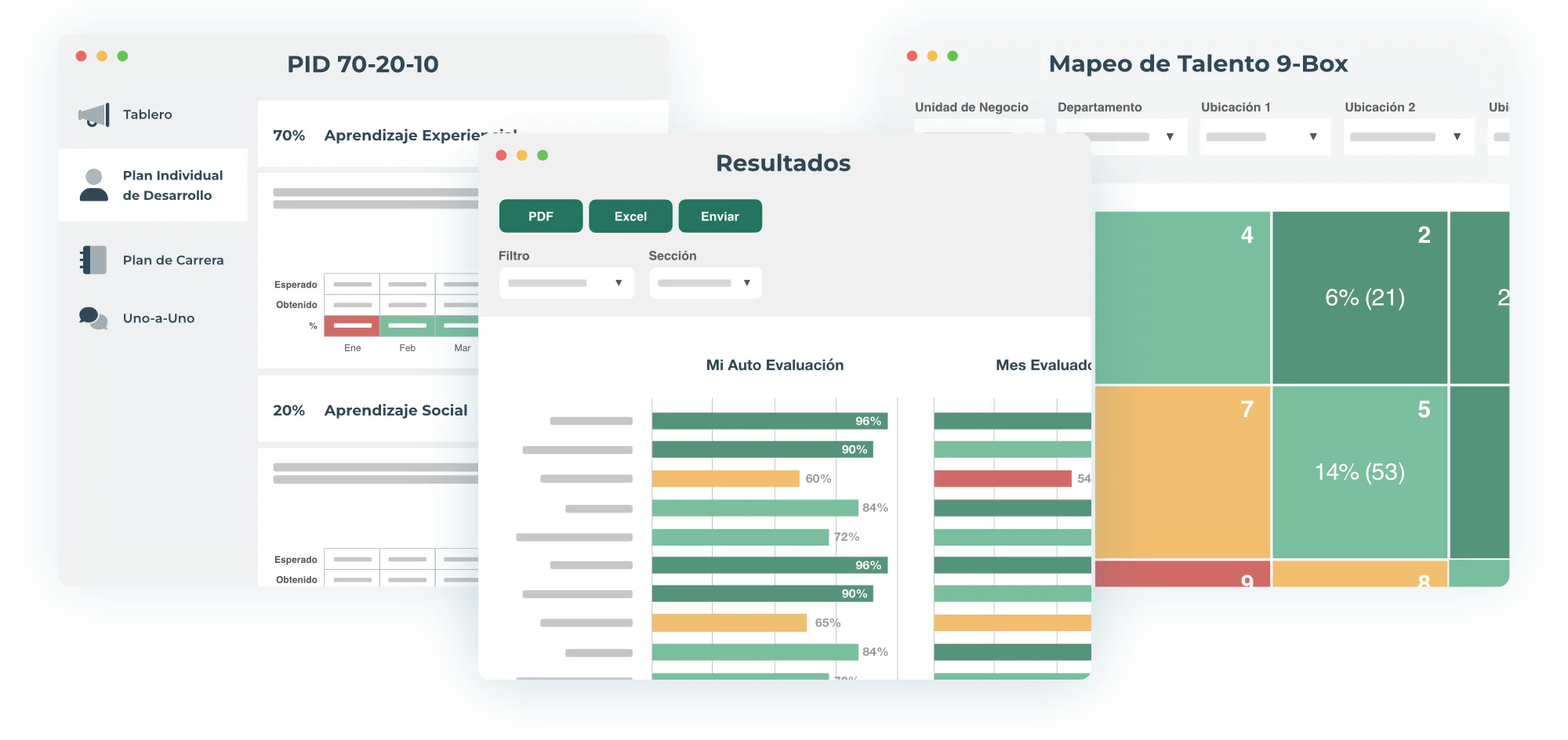 Genera reportes individuales con gráficas de resultados por competencia, comparativos entre evaluadores, fortalezas, áreas de oportunidad y planes de desarrollo personalizados. También puedes exportar reportes grupales en PDF y Excel.