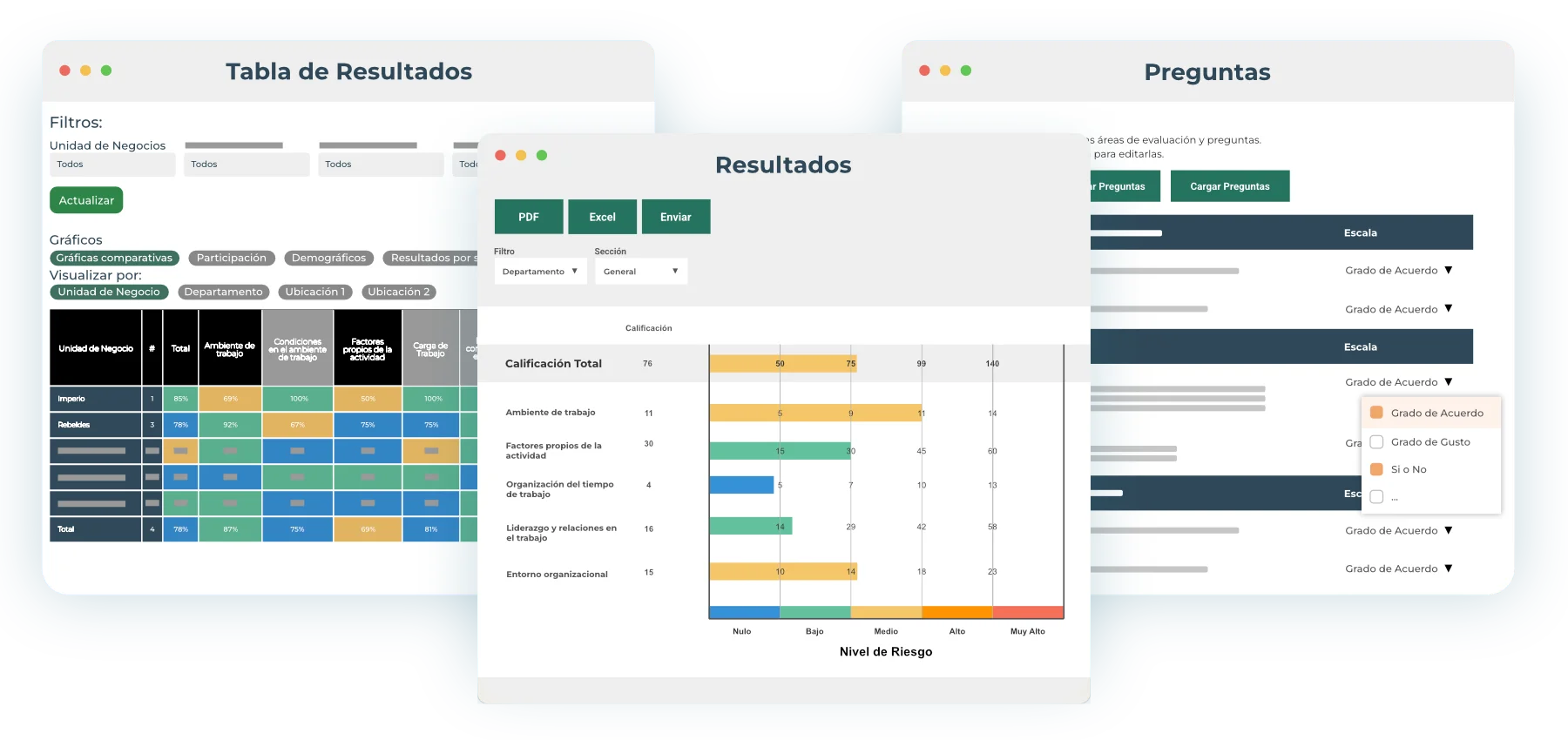 La plataforma califica automáticamente según los criterios de la norma (nulo, bajo, medio, alto, muy alto) y genera reportes con gráficas, mapas de calor por área y recomendaciones de acción para cada nivel de riesgo identificado.